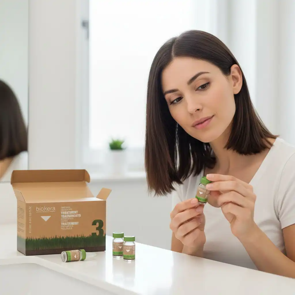 Laver les cheveux avec le shampoing et le masque Biokera Antipelliculaire. Appliquer une ampoule sur le cuir chevelu en séparant les mèches, puis masser doucement. Ne pas rincer et sécher comme d’habitude.